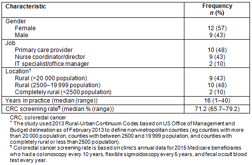 Table 1 displays characteristics of individual interviewees (n=21). Final participants included 10 PCPs (48%), 9 nurse coordinators (43%), and 2 IT/administrative personnel (10%). More than half (57%) of the interview participants were female. Participants had a median of 16 years of experience, from a minimum of 1 year to a maximum of 40 years. All the participating clinics are located in rural areas, as defined by the US Department of Agriculture Economic Research Service29. Nine are from rural areas with population of 20 000 or more, while 10 are from rural areas with populations between 2500 and 19 999. Two participants are from a completely rural area according to the Rural-Urban Continuum Code. The participating clinics' annual CRC screening rate for Medicare beneficiaries ranged from 65.7% to 79.2% in 2015 (Table 1).