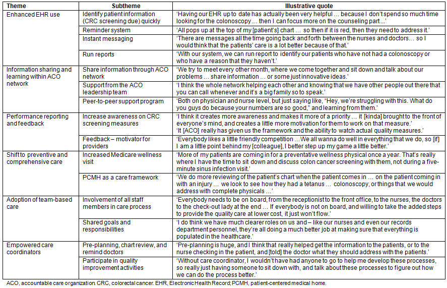Performance measures and feedback: The study participants appeared to have a broad consensus regarding the positive impact of using standardized measures required by CMS. They noted increased awareness among all the staff of the need to pay attention to those measures (eg percentage of patients who are up to date with CRC screening). The standardized quality measures gives them a structured framework of 'what' quality they need to focus on. Feedback mechanism was perceived to be of great value under the ACO model. Use of standardized measures and reporting these measures also enabled an ACO to receive feedback about their performance at a group level and at a clinic level. Group-level feedback is provided by the CMS when CMS compares performance scores of a certain ACO to their benchmarks. Clinic level feedback is provided by the ACO leadership team by comparing each clinic's performance to that of other clinics within the same ACO group. Most clinics have the capacity to retrieve their own charts and compare their numbers to other clinics or other providers. An RN care coordinator said: