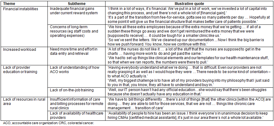 Despite all the opportunities for promoting CRC screening, operational and system-level challenges associated with this new delivery care model were found: financial instabilities, staff workload, lack of training or education opportunities, and lack of resources in rural areas. Table 3 shows four themes and related subthemes, as well as illustrative quotes regarding perceived challenges of the ACO model.