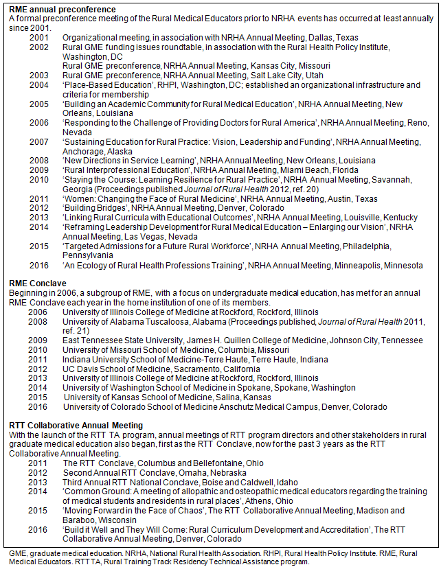The emergence of the RME from the San Antonio meeting in 2000 and the subsequent growth of this community has occurred through annual meetings, peer consultations, email interchanges and social media, and in-person visits to rural programs and rural communities, which has resulted in several publications20,21. A formal preconference meeting of the RME prior to NRHA events has occurred at least annually since 2001 (Box 1). Beginning in 2006, a subgroup of RME, with a focus on undergraduate medical education, has met for an annual RME Conclave, in the home institution of one of its members. Then, with the launch of the RTT TA program in 2010, annual meetings of RTT program directors and other stakeholders also began, focused on rural graduate medical education and patterned on the successful interactions of the RME group and its conclave. Reciprocal peer consultations, such as an in-person visit that occurred between two RTT program directors in Colville, Washington, and Bellefontaine, Ohio, in 2010, and subsequent visits under the RTT TA program, have benefited programs and rural communities from Centreville, Alabama, to Hettinger, North Dakota; from Ramona, Oklahoma, to Glens Falls and Plattsburg, New York.