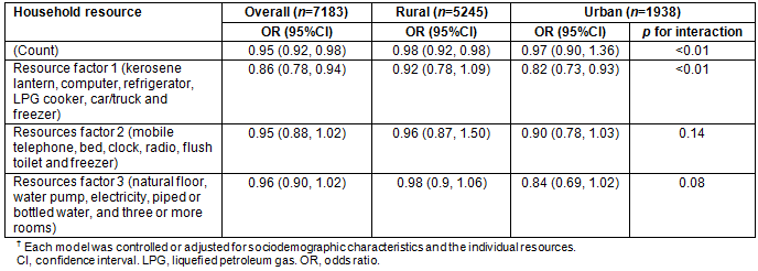With respect to the three household resource domains created using factor analysis (Table 2), factor 1, which represented items for food preparation and storage, was significantly associated with child mortality in analyses including the entire sample. Households that reported more factor 1 resources had a lower odds of child mortality (AOR=0.86; 95%CI: 0.78, 0.94) than households that reported fewer. In stratified analyses, factor 1 was significantly associated with lower odds of child mortality in urban areas (AOR=0.82; 95%CI: 0.73, 0.93), but only marginally in rural areas (AOR=0.92; 95%CI: 0.78, 1.09). Household resource factor 2, which represented electronic items (AOR=0.95; 95%CI: 0.88, 1.02), and factor 3, which represented shared water and sanitation items (AOR=0.96; 95%CI: 0.90, 1.02), were only marginally associated with child mortality in the entire sample. In stratified analyses, factor 2 and factor 3 were marginally associated with a lower odds of child mortality in urban area, but in rural areas neither were associated with the odds of child mortality.