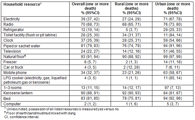 Several Ghanaian studies have suggested that child mortality is higher among women with low SES, for first order births compared with second and third order births and among children who live in rural areas versus urban areas5,8,11-13. However, none of these studies examined child mortality in relation to household resources, although such resources are shown to be important determinants in studies of mortality in other countries1-3. The present study was designed to test associations between household resources and child mortality in Ghana, controlling for maternal education as a measure of SES. Because the child mortality risk is 36% lower for children living in urban areas compared to children in rural areas of Ghana5, urban versus rural residence was tested as a potential effect modifier of associations between household resource possession and child mortality. Findings from this study could be used to inform public health interventions expected to address the indirect causes of child mortality in the general population and within sociodemographic subgroups. For example in 2015, the World Health Organization called on community health workers in low resource settings to conduct assessment of household resources among families with children to guide counseling and education to address the identified needs. Understanding the prevalence and role of specific household resources in child mortality by rurality would support Ghana and similar sub-Saharan African countries to move toward achieving the child mortality targets specified in the Sustainable Development Goals to reduce under-5 mortality to at least as low as 25 per 1000 live births14.