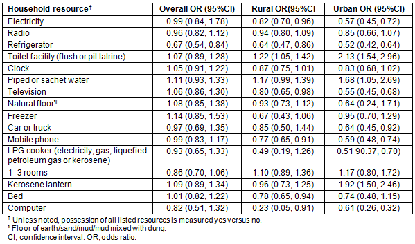 Household resources: The independent variable was household resources. The GMHS survey included the following 16 household resources items (each measured as a binary yes or no): electricity, radio, refrigerator, toilet facility, clock, pipe or sachet water, television, polished floor, freezer, car or truck, mobile phone, liquefied petroleum gas (LPG) cooker, having one to 3 bedrooms, kerosene lantern, bed and computer. An index representing the total number of resources in the house was created by counting the number of items each woman responded to with 'yes'. The overall household resource index ranged from 0 to 16; a higher score was reflective of more resources.