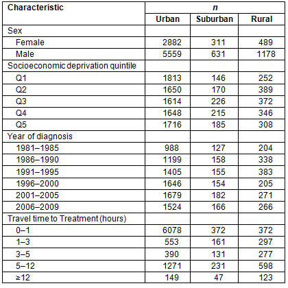 Of the 11 050 patients records analysed, 33.3% were female. The distribution of patients' neighborhood type was 76.4% urban, 8.5% suburban, and 15.1% rural, consistent with the population distribution of BC. A total of 62% of patients lived within 1 hour of a treatment center at their time of diagnosis, while only 3% lived more than 12 hours by automobile and/or ferry (Table 1). All of these distributions were temporally stable throughout the study period.