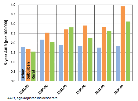 Age-adjusted incidence rates were found to vary across the study period, as shown in Figure 1. Suburban and rural rates have increased overall, with the sharpest increase observed for suburban patients, as previously reported for oral cavity cancers23.
