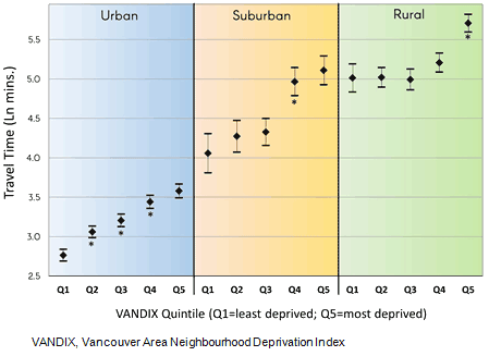 Figure 2: Natural log-transformed travel times to nearest cancer treatment center by neighborhood type and Vancouver Area Neighbourhood Deprivation Index quintile, with means and 95% confidence interval. Asterisks denote statistically significant increases in travel time above previous quintile.