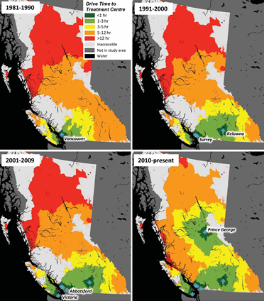 Figure 3: Time-series maps of British Columbia Cancer Agency comprehensive cancer treatment centers, by decade. Colored regions indicate drive time to the nearest center.