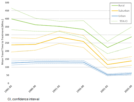 While the establishment of new treatment centers has contributed to a decreased patient travel times in recent decades, an increase is observed for rural patients from 2005 to 2009, as shown in Figure 4. Statistically significant differences in travel time were observed between neighborhood types, because the majority of comprehensive cancer treatment centers are located in BC's major urban centers. A widening disparity between neighborhood types in the most recent time period (2005-2009) is indicative of a rise in head and neck cancer incidence farther from urban centers.