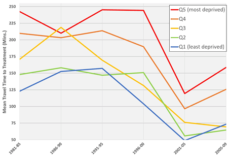 Figure 5: Mean travel time to nearest treatment center for each socioeconomic deprivation quintile by 5-year period. A convergence of average travel time is observed for the three least deprived quintiles of patients, while recent increases are observed for the two most deprived quintiles.