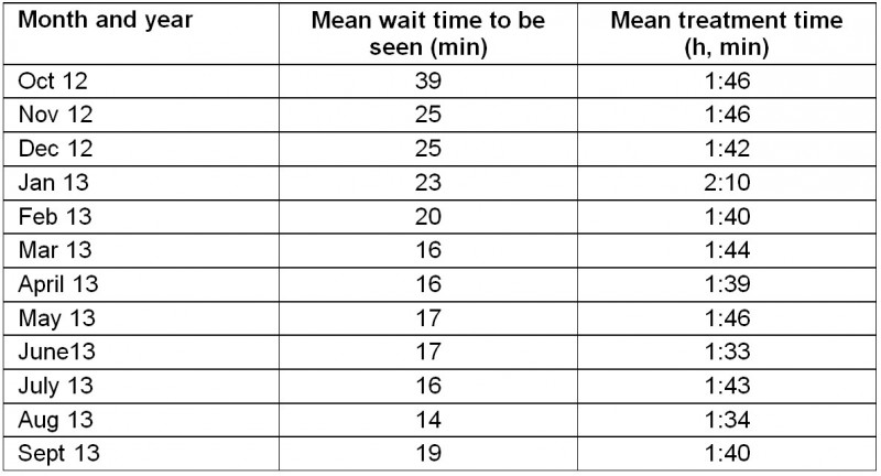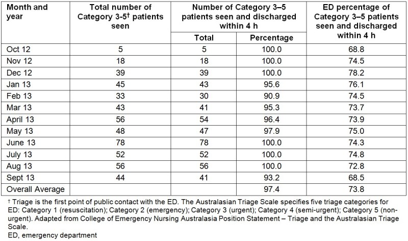 Design: The study was a descriptive observational design using mixed method data collection techniques. Data mining of ED administrative and clinical data sets included the number of primary and secondary contacts per shift, mean waiting time to be seen, proportion of patients discharged home within 4 h and mean length of stay in ED. Patient and staff satisfaction surveys were also conducted. An ‘issues log’ of challenges and how they were addressed derived from discussions at project implementation and steering committee meetings was maintained by the project officer.