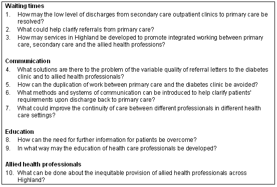 These questions were presented to a regional solutions conference to generate discussion and determine sustainable solutions to the issues raised as areas of system improvement in the mapping process. Invitations to attend this conference were distributed to all general practices, all secondary care personal involved in the care of people with diabetes, and to all patient and carer groups in Highland. Delegates were divided into small facilitated groups and, for each, the discussions and solutions to the questions posed were recorded.