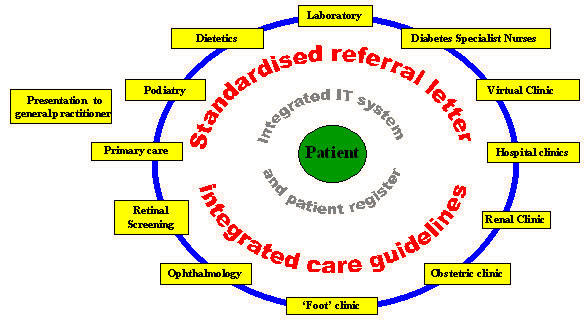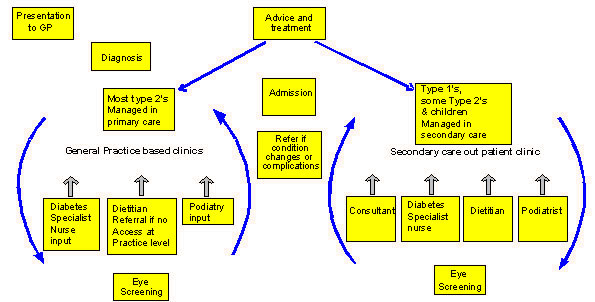 The child or adult with diabetes will usually present within primary care, and becomes the centre of the system. Access to health-care professionals will be possible, on referral, within a non-hierarchical and integrated managed clinical network of services.