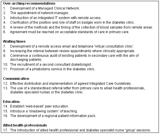 The practical recommendations to the secondary care services of increasing the interval between review appointments and auditing the existing people on the waiting list are similar to other initiatives to reduce waiting times in other areas of health care. Reviewing consultant diabetology resources reflected an element of local political difficulties.