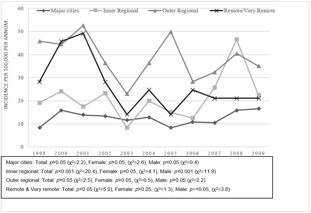 Incidence was higher in males than females (Table 1) for every region, across all age groups, for every year of the study. For both males and females, incidence was greatest in outer regional areas (males: 51.8/100 000; 95%CI=51.67–51.99; females 32.5/100 000; 95%CI=32.42–32.63). Relative risk was consistently higher for males in each region (Table 2).