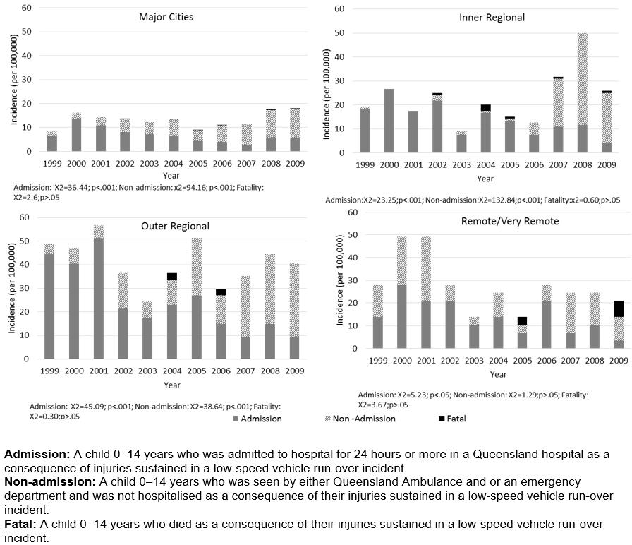 The aim of this article is to describe incidence rates of LSVRO events for various areas of remoteness in children aged 0–14 years in Queensland, from 199 to 2009, and to describe the associated patterns of injury, with respect to gender, age group, severity, characteristics (host, vehicle and environment), and trends over time.