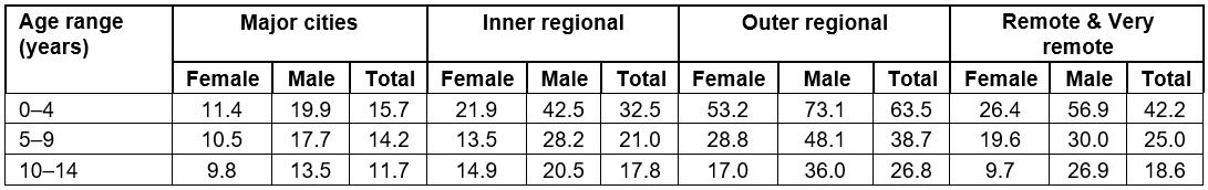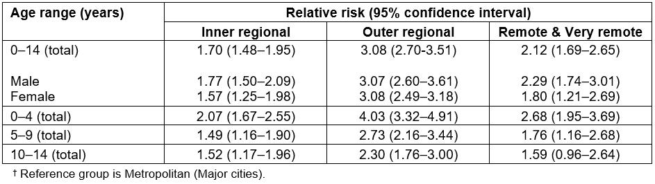 Crude incidence rates for LSVRO events were calculated separately for the four remoteness categories. The Australian Bureau of Statistics provides population data for each single year of age, for each remoteness category, from 1901 until 2006. After 2006, population data are only available for each remoteness category for age groups (not single year of age), and not for every calendar year. The summary data on age groups per remoteness category from 2006 were compared with the population data provided per age year, for calendar years up until 2006. There were no marked differences relating to the age group of interest in this study (0–14 years).