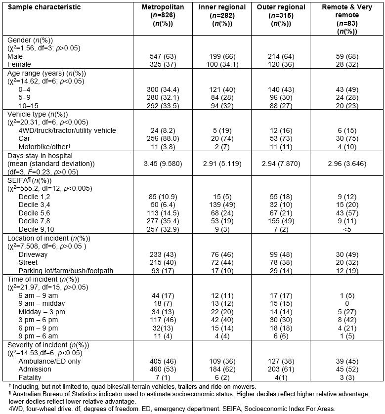 Descriptive analyses were used to examine the patterns of injury in children across the various remoteness categories. Where variables were categorical, χ2 analysis was used. (Where expected cell counts were less than 5, Fisher’s exact method was used.) For continuous variables, t-tests or analysis of variance (ANOVA) were used. Where data were not parametric or group sizes were less than 30, Mann–Whitney U-tests or Kruskal–Wallis tests were used.
