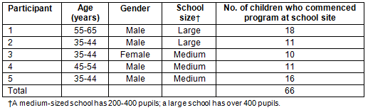 Participant principals and deputy principal (school executive): Four principals and one assistant principal from government schools were interviewed (Table 1). Two of their five school sites were in the same town. The towns varied in population size from about 2500 to about 32 500, and varied in driving distance from Sydney, the capital of NSW, from about 360 km to about 700 km.