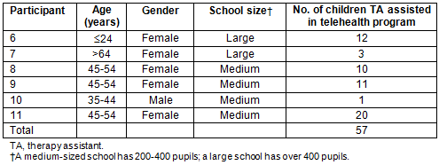 While five of the six TAs commented that they planned to continue their participation in the telehealth program, they all reported that it could be improved through added supports for their TA role. Some were of the view that before agreeing to participate, potential TA's should have detailed discussions with the school executive and the SLP about the necessary and likely time commitments, requirements, the lines of communication and control, work scheduling arrangements, adjustments to duty statements, and infrastructure provided as supports. 'There were a lot of people involved with it so you didn't quite know who to go to' (Participant 10). 'I'd certainly recommend, just an outline to our principal that we need these particular resources, human and non-human' (Participant 9). The TAs reported that from their experience the telehealth program was sufficiently acceptable and feasible that it should be continued and offered elsewhere, with these supports.