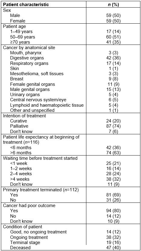Table 1 shows cancer diagnosis by site, with digestive organs as the major localisation of cancer. All major forms of cancer were represented. Sixty percent of the patients were alive at the time of registration, 16% were in the terminal stage and 12% were in a good condition without ongoing treatment. For 20% of the patients the intention of treatment was curative and the GPs reported that life expectancy at the beginning of treatment was more than 6 months for 63% of the patients. One-third of the patients waited more than 4 weeks before treatment started. The clinical status had been declining for 80% of the patients.