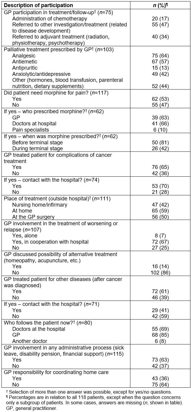 Table 2: General practitioner participation in drug and adjuvant treatment of cancer patients (n=118)