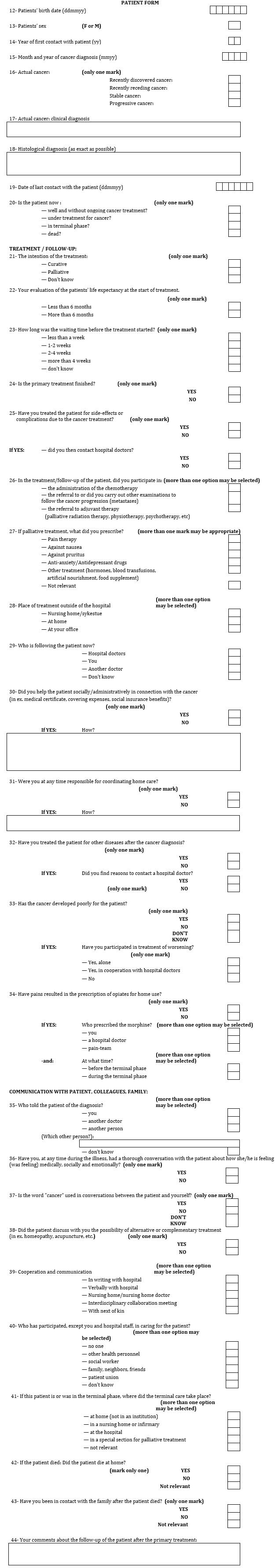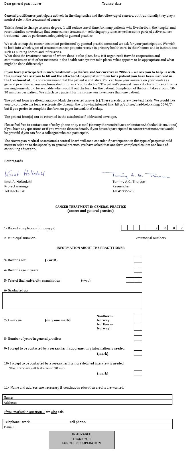 The chief municipal medical officer in 178 Norwegian municipalities in April 2007 received an invitation letter together with enclosed letters to GPs containing self-explanatory four-page questionnaires (Appendix I), modified from a previous study18. The medical chief was asked to identify up to five GPs who might have participated in local treatment of cancer patients in 2006–07 and to forward the questionnaire to them. Thus, the intention was to recruit a rather select group of GPs who had experience from work with cancer patients. All 93 municipalities in North Norway and a 25% random sample (85 municipalities) in South Norway received the invitation. Treatment intention could have been curative or palliative. The anonymous patient could be alive or dead at the time of reporting. In addition to marking pre-defined answers, the GPs were encouraged to give free-text commentaries.