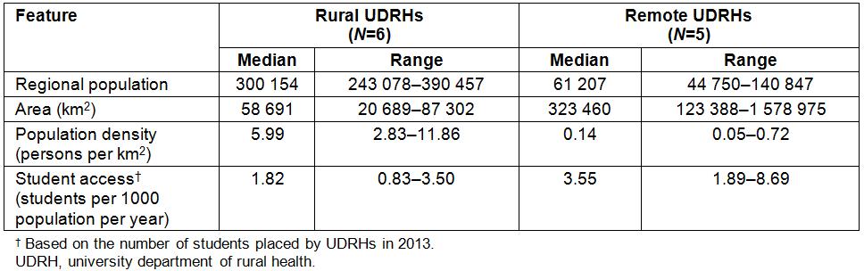 In 1996, the Australian Government established the first regionally based, multi-professional university department of rural health (UDRH).1,2 The UDRH program aimed to provide education and training facilities in non-metropolitan centres across Australia, thereby helping to attract health professionals to practise in rural and remote communities. The program continues as one of several government initiatives in tertiary education designed to strengthen and sustain rural and remote health care. These include admitting more students of rural origin into health courses and requiring at least 1 year of clinical training in a rural or remote community for 25% of Australian medical students (Rural Clinical Training and Support Program – Rural Clinical Schools).3 The rationale of these initiatives was an expectation that local access to clinical training for students of rural and remote origin and extended clinical exposure of other students interested in rural health care would increase the likelihood of employment uptake in these areas post-graduation.
