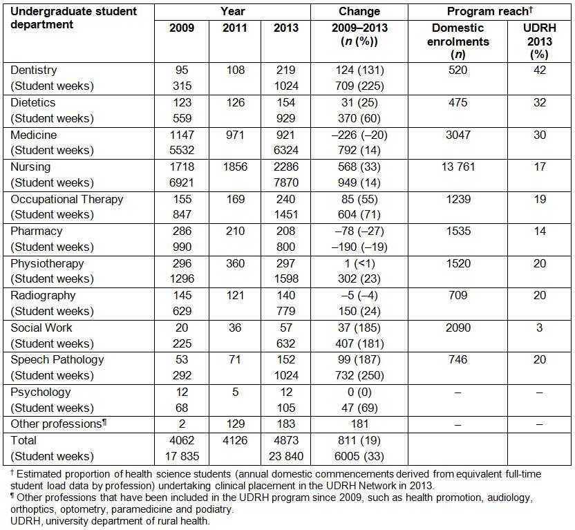 The effects of UDRH support varied among disciplines, with several major allied health disciplines benefiting through increased placements, while other disciplines, such as social work and psychology, continued to have limited rural and remote exposure. The UDRH Network, with its multidisciplinary orientation, complements and interacts with rural clinical schools, which concentrate on training medical students. The combination represents a carefully constructed system of rural health professional education and a significant commitment by the Australian Government to rural and remote health workforce development.