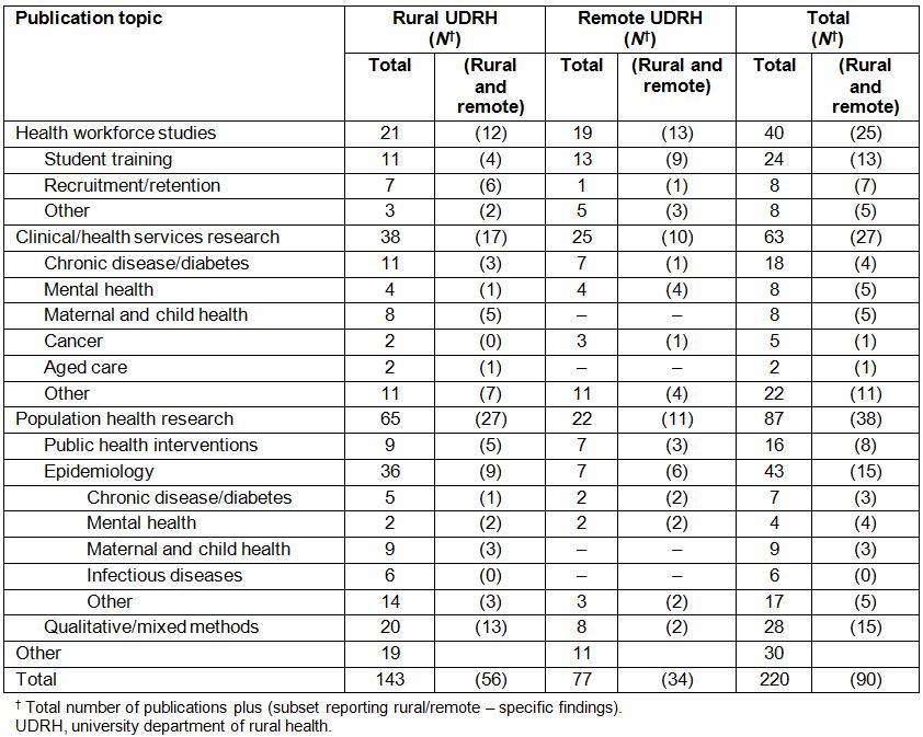 The abstracts of all peer-reviewed research outputs generated by UDRHs and listed in KPI research activity reports for 2013 were reviewed and classified according to the broad type of research (workforce, clinical/health services, population health), topic areas (mental health, diabetes), and rural/remote focus.