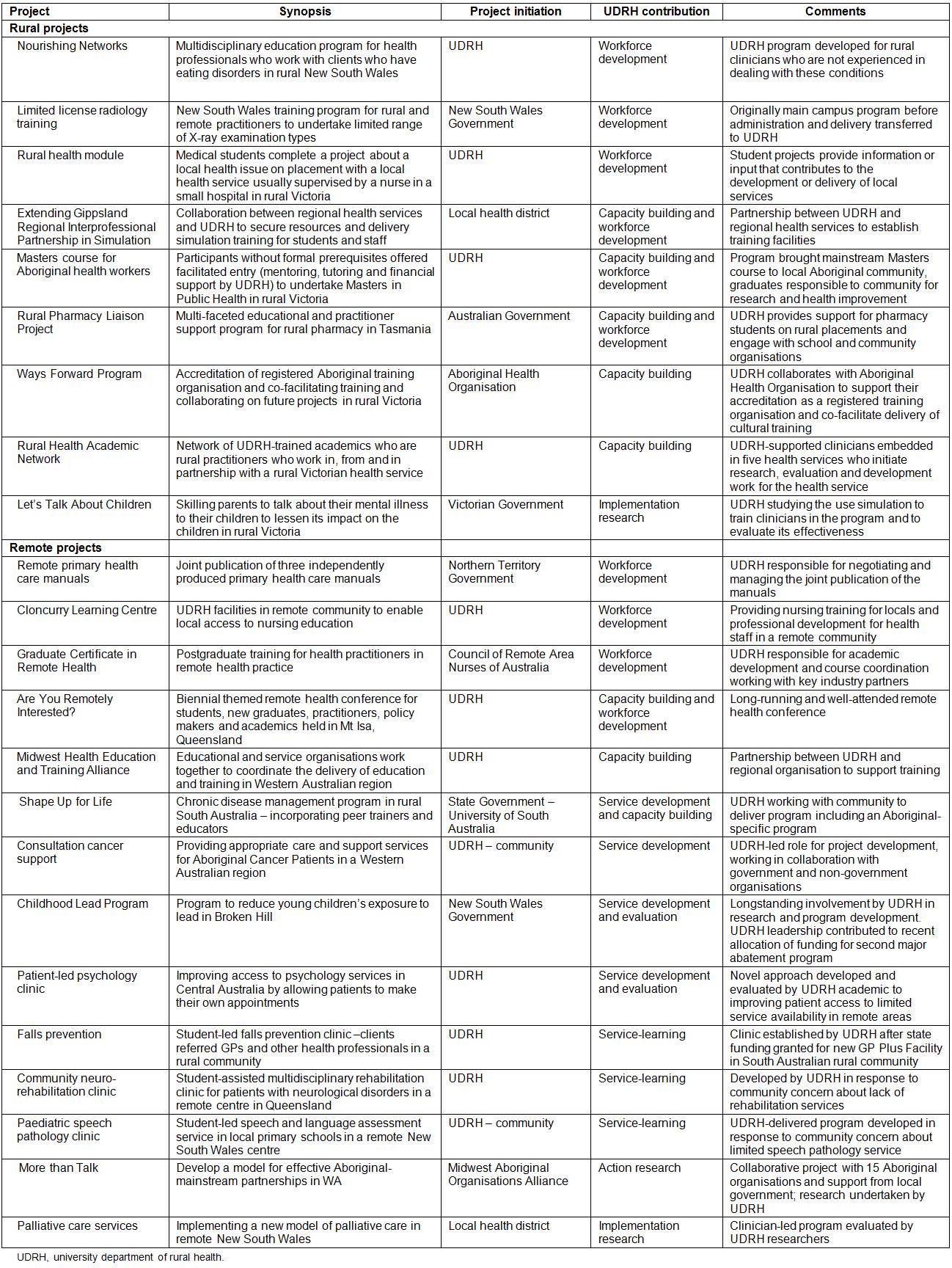 Table 4 provides examples of sentinel network projects that targeted priority rural and remote health issues within the UDRH catchments, some of which have been formally evaluated. They exemplify both UDRH investment and leadership in rural workforce and training development programs such as limited license radiology training14 and publication of remote healthcare manuals,15 health service development including patient-led psychology clinics,16 service delivery such as neuro-rehabilitation17 and speech pathology student-led clinics,13 and capacity building such as the Midwest Health Education and Training Alliance.18 Most projects were regionally based and responded either to government, health service or professional priorities, or community and clinician concerns. The UDRH contribution included academic services, support and infrastructure relating to research, evaluation, and education and training, as well as providing advanced expertise in service and organisational development, clinical services, and capacity building.