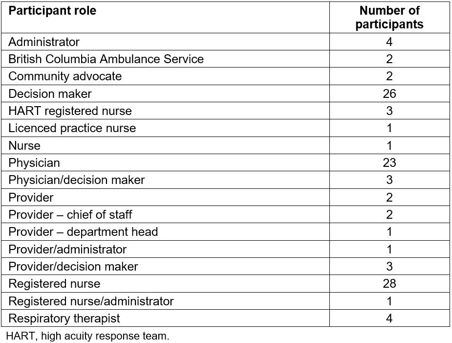 Research participants in base sites included HART team members (CCRNs and RRTs) and administrative leads for the HART base hospitals. Research participants in the peripheral sites included local hospital administrators, local physicians who participate in ED calls, and ED nurses. Research participants in the central administrative site included those involved in supporting HART at an administrative level. Participants were identified through key contacts within the HART program and a letter of invitation was sent to each. Postcard reminders and follow-up phone calls were used to achieve a high participation rate (n=107). Two interviews with provincial key informants were completed by teleconference; otherwise, interviews were held at a location convenient to the participant (usually their clinical offices) and lasted on average one hour.