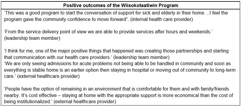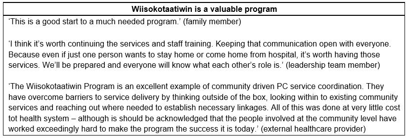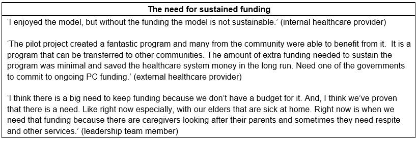 Overall, the findings suggest that the main goal of the program, to enhance and integrate existing services so that people have the option to receive PC at home, was met. Though not a costing study, the evaluation data suggest that keeping First Nations community members at home is not very expensive. The C$60 000 pilot funding allowed for the enhancement of existing services to address gaps in community capacity to provide PC. However, due to lack of sustained service delivery funds, enhanced services were unable to be provided once the pilot ended.