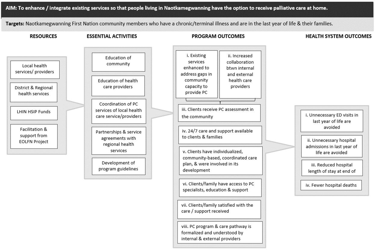 Through the enhancement and integration of existing services, Wiisokotaatiwin sought to provide people living in Naotkamegwanning the option to receive care at home by allowing for services and supports to be available 24 hours a day, 7 days a week in Naotkamegwanning. The required resources, essential activities and intended outcomes are summarized in Figure 1.