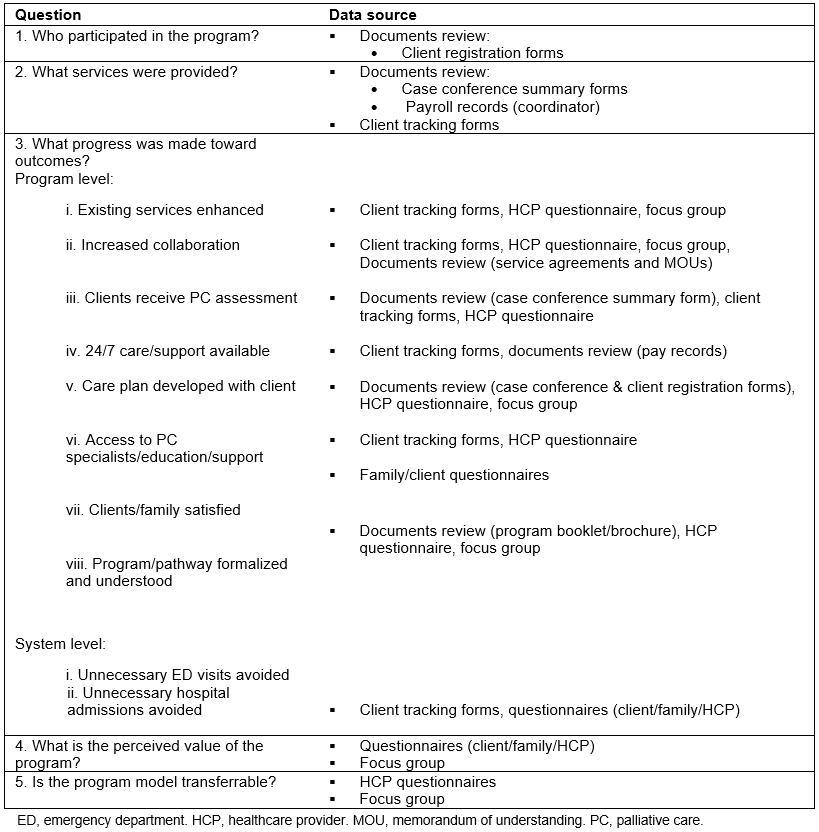 All essential activities and resources (Fig1) were in place, and were essential to implement the program and achieve its outcomes. In terms of resources, there were sufficient infrastructure and health services to allow development of the local PC program28,28. Specifically, there were local PC service providers and district and regional health services who were available and motivated to assist (Table 2). This allowed for the adoption of a service enhancement and integration model. Moreover, the facilitation and support from the EOLFN research team supported the program development and implementation, and the LHIN pilot funding was instrumental in implementing the program0.