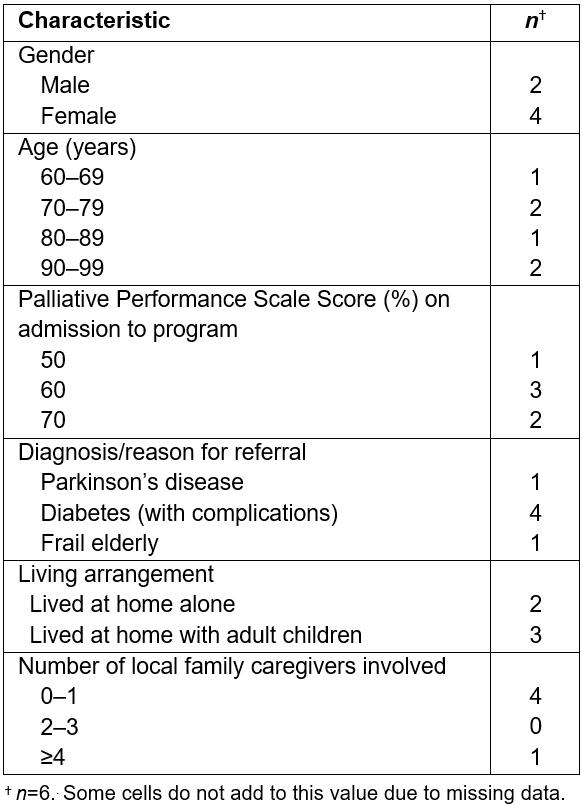 Seven community members were identified as eligible for the program. One member died early in the pilot, and did not receive services. Therefore, the evaluation focused on the services received by six clients. Four clients were on the program for the 10-month pilot; two registered toward the end of the pilot (May/June 2015). Table 4 details client demographic characteristics.