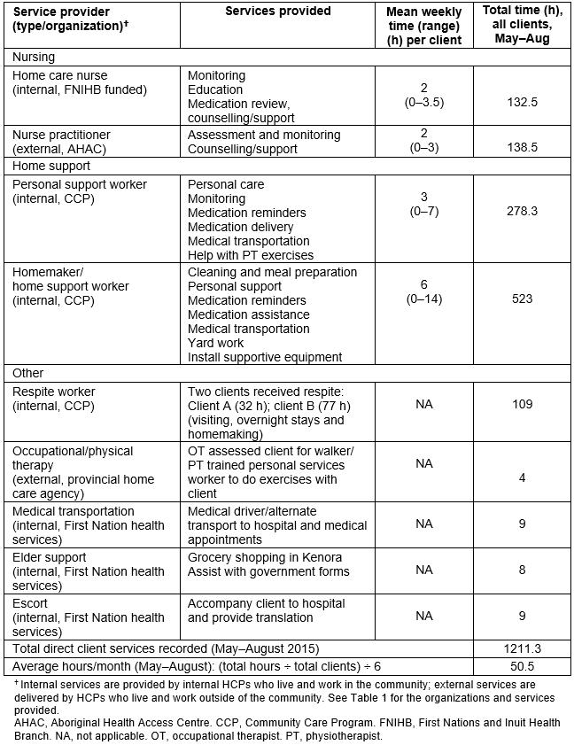 i. Existing services enhanced Most of the pilot funding was spent on enhanced services for the six clients. Most of the services documented were an enhancement of the existing Naotkamegwanning health services (eg NP services, FNIHB nursing and program coordinator available on call, and additional FNIHB home care nursing and CCP home support hours), and provided to clients outside of the existing CCP hours (enhanced services; Table 5 and Fig3).