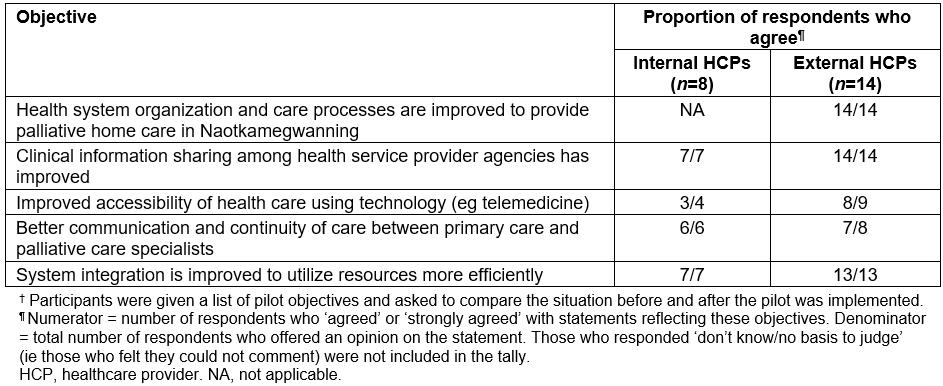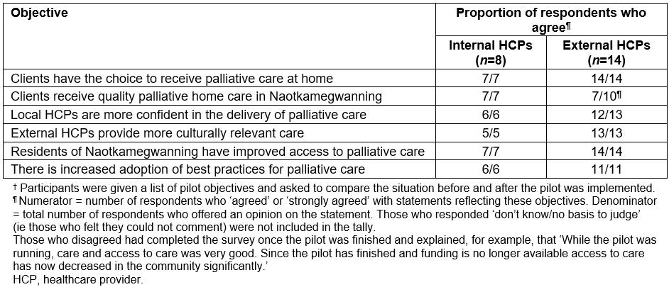 The internal and external HCPs involved in the pilot were also invited to complete an end-of-pilot questionnaire. The questionnaire consisted of closed and open-ended questions (25 items) that probed the HCPs’ satisfaction with the pilot and their perceptions of the program’s value, the extent to which it met its objectives, and its transferability to other First Nations communities. A total of 22 completed questionnaires were returned: 8 internal HCPs (nurses, personal support workers, homemakers; an 89% response rate) and 14 external HCPs (a 74% response rate). The quantitative data were entered in SPSS for frequency analysis. The qualitative comments were analyzed using Thomas’s general inductive approach to identify themes in the text that were related to the evaluation questions0.