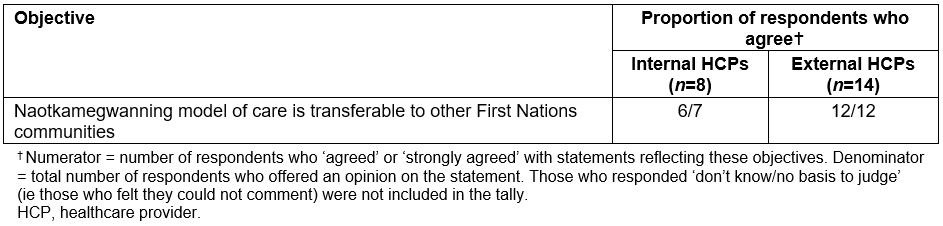 The HCPs involved in the project thought that the program model was transferrable to other First Nations communities (Table 9).