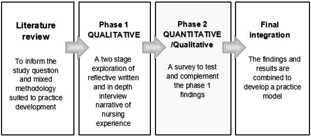 Pragmatism informed the sequential mixed methods study designed with two phases24 (Fig1). Pragmatism is a ‘philosophical stance that embraces multiple view-points of a research problem’25. A pragmatic approach framed the collection and integration of the mix of qualitative and quantitative data gathered in the exploration of the complex practice question26. In phase 1, DNs from rural Victoria, Australia, were invited to volunteer in a two-stage process of narrative exploration conducted to understand the meanings and process of advocacy in the private world of rural home care23. Qualitative findings from the combination of reflective written experiences and follow-up in-depth interviews provided a beginning understanding of how DNs (N=7) successfully advocate for the EoL goals of rural Australians23. The findings of enabling factors, diverse advocacy actions and the emotional intelligence (EI) required for rural EoL advocacy23 informed phase 2 of study in the construction of the survey of a larger DN sample from across Australia (N=91). Likert scales and open-ended questions were designed to test and complement the findings23 and produce original results.
