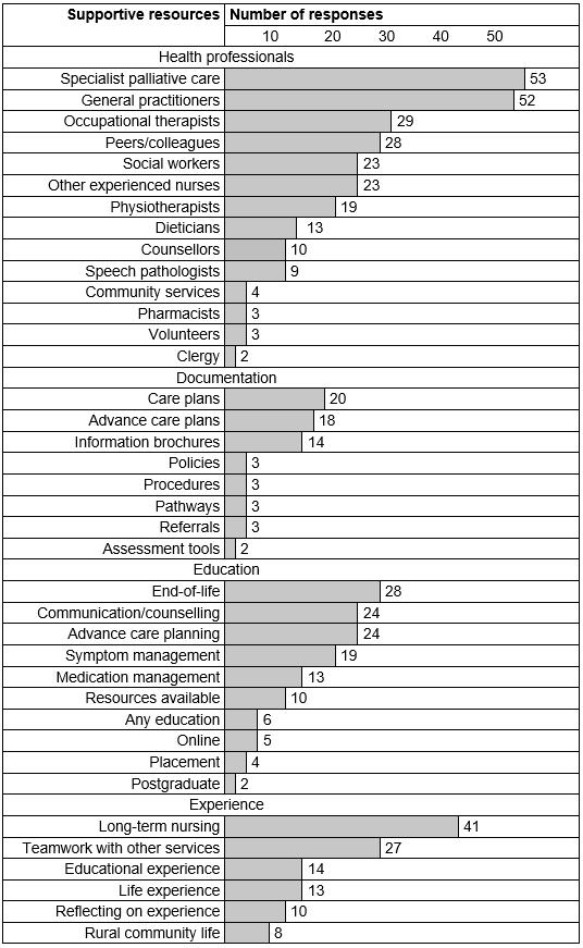 The most common support provided by others was identified from palliative specialist doctors and/or nurses (n=53) and general practitioners (n=52). Support from nursing peers and allied health professionals, especially occupational therapists, also featured highly in the responses. The education found to be supportive was most commonly reported as EoL training (n=28), closely followed by communication, symptom management and advance care planning. The most supportive documentation was reported as care plans that provide clear goals (n=20), and advance care plans, followed by simple information to give to people.