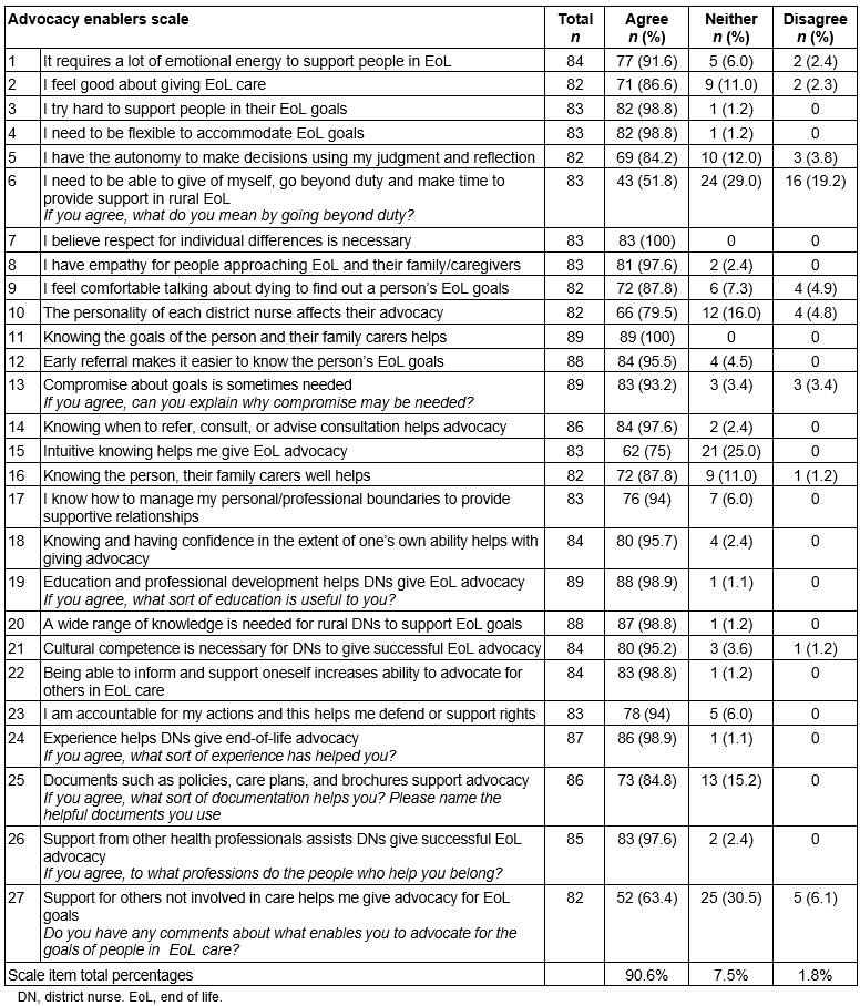 Two scale items received 100% agreement: ‘I believe respect for individual differences is necessary in my role’ and ‘knowing the goals of the person receiving EoL care and their family carers’ helps’. Advocacy enabled by ‘early referrals, self-understanding and confidence’, ‘knowing how to balance relationship boundaries’ and ‘when to refer and consult’ were all rated very highly. Respondents who agreed that ‘compromise of goals is sometimes needed’ (93.2%; n=83) were asked to expand with their knowledge about why this occurs. Responses outlined expectations that were unrealistic due to limited service hours, staff expertise or availability, sudden unmanageable deterioration in health, and insufficient carer support or coping. Some goals reportedly lacked the general practitioner’s support, adequate information for preparation, or were illegal or unsafe for nurse participation. Knowledge of the rural people and the resources available were confirmed as enabling EoL goal modifications that met with satisfaction.