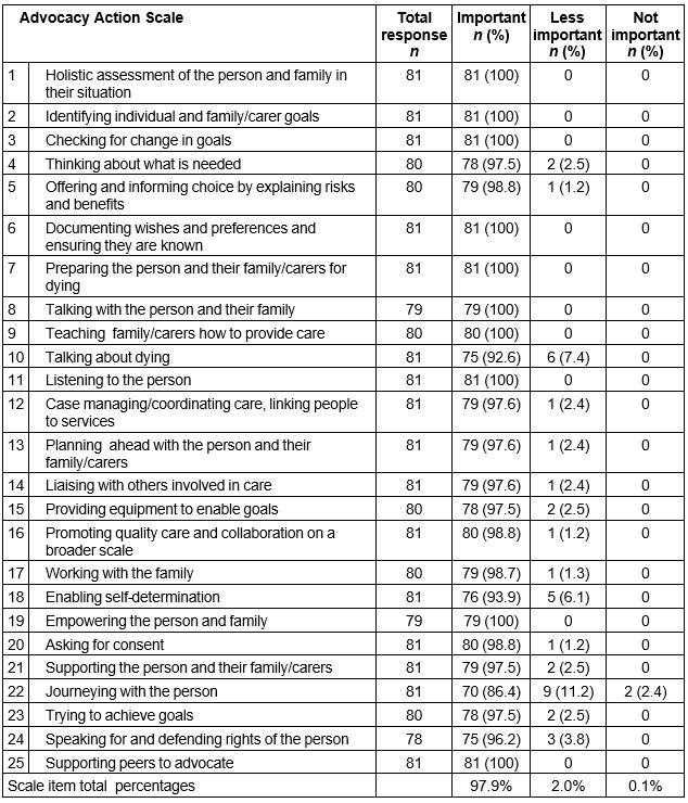 The advocacy actions identified by rural DNs as important for EoL advocacy success in phase 1 of the study23 were confirmed by the results of the survey. The rate of missing data varied in this section, resulting in 79–81 responses per item. The types of actions used in advocating for person-centred goals found in phase 123 were used in the scale items that are in Table 2. The actions required for successful advocacy were rated highly on a scale of importance by 97.9% of the respondents overall. Many items were rated as important by 100% of respondents: ‘holistic assessment’, ‘identifying the individual goals of the person and family carers’, ‘checking for change in goals’, ‘effective listening, talking’ and ‘preparing the person and family for dying’; also ‘teaching family how to provide care’, ‘empowering the person and family’ and ‘supporting peers to advocate’. There was little variation in the responses and the only item to receive any negative response (n=2) was ‘journeying with the person’.