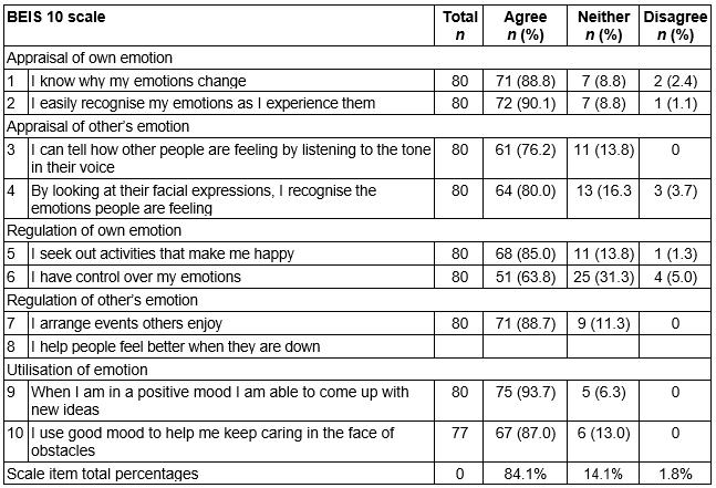 The emotional skills described by DNs in their successful advocacy experiences in phase 1 of the study23 reflect the five concepts of EI itemised in Table 3. Eighty respondents rated the items, until the last item, which received 77 responses. The overall agreement received in the BEIS 10 (84.8%) demonstrates the respondents self-rated their EI positively. The items that assessed the use of emotion were rated most highly. None of the respondents disagreed to the utilisation of good mood to ‘come up with new ideas’ and continue ‘caring in the face of obstacles’. Overall there was 1.8% disagreement to the BEIS 10 items. The item assessing the respondent’s ability to control personal emotions received the greatest disagreement (5%; n=4).