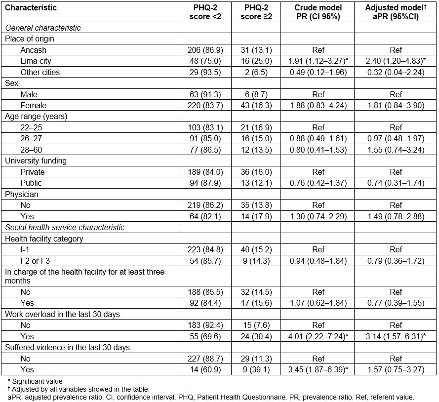 Table 2: Factors associated with obtaining a PHQ-2 score ≥2 in health professionals performing social health service in Ancash, Peru, 2015