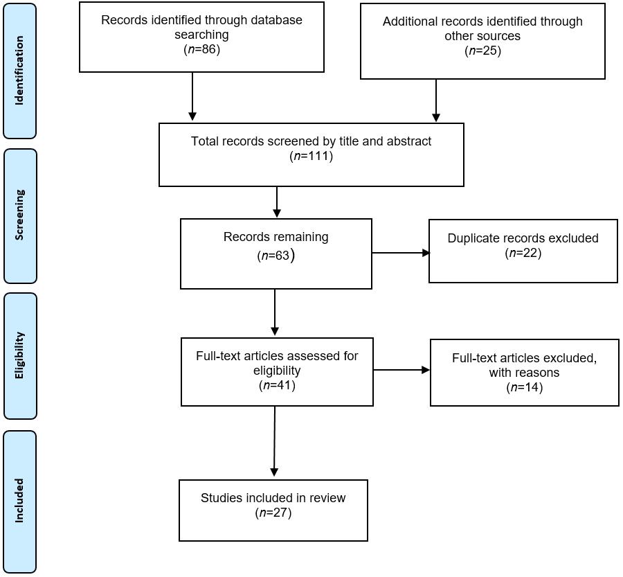 The search was undertaken by the first author with advice from a research librarian. Titles and abstracts were screened against the inclusion and exclusion criteria. The initial search, including those sourced from reference lists, identified 111 articles. After reviewing the titles and abstracts against inclusion criteria, 63 were retrieved for detailed review. Duplicates were eliminated, leaving a total of 41 articles. Ten studies were reported twice and four lacked detail, effectively reducing the number of included studies to 27 (Fig1). Similar to the approach adopted by Reeves and colleagues23, studies were not excluded on the grounds of methodological quality but were examined with a specific lens prescribed by the review objectives and inclusion criteria47.
