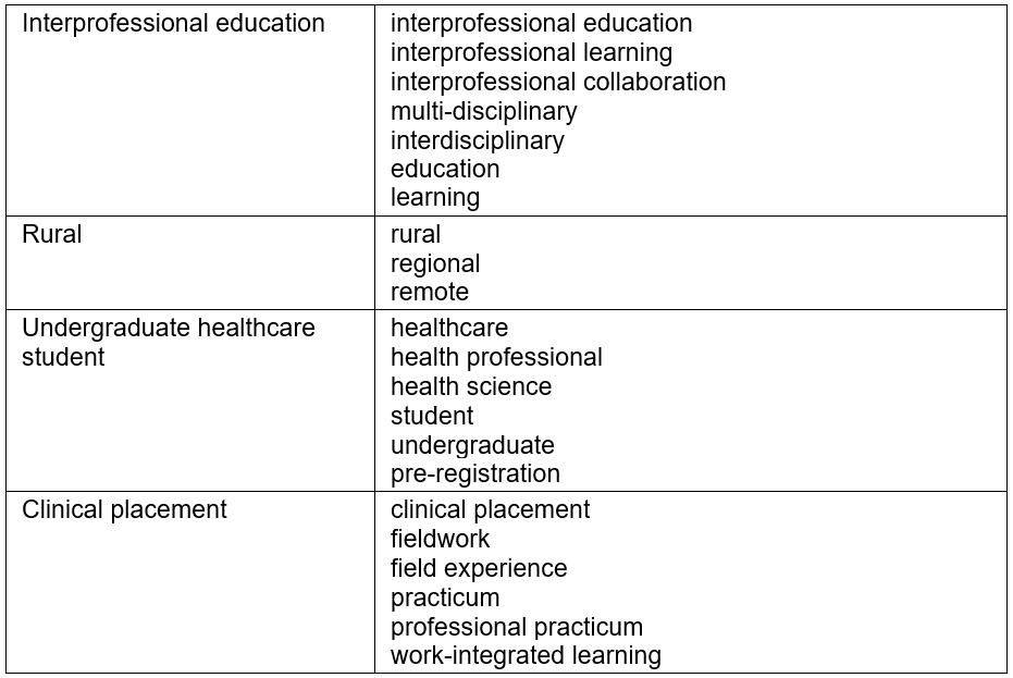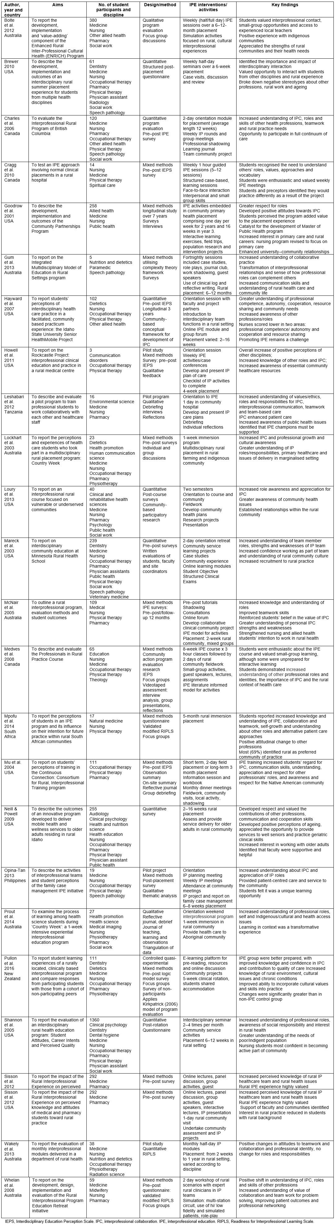 Although the literature search was extensive, some studies may have been missed by the search strategy because of the content of titles and abstracts, those published in languages other than English. Others may have been missed due to lack of information, or because of researcher bias. The reviewers are invested in the field and therefore may have unwittingly ascribed bias to the review process. To mitigate bias and promote rigour, advice was sought from a research librarian, and the authors individually searched for additional articles, independently reviewed the articles and collectively discussed the findings. Another limitation was that this review focused on IPE opportunities for students from different disciplines undertaking rural placements to interact, engage and learn with and from other students. As such, it does not address the opportunities the rural clinical learning environment affords for students to work individually within a small interdisciplinary team or the potential of other learning environments to provide IPE. Finally, although the scope of the review focused on profiling the IPE initiatives provided to students rather than exploring the challenges and barriers, some findings suggest these warrant further investigation.