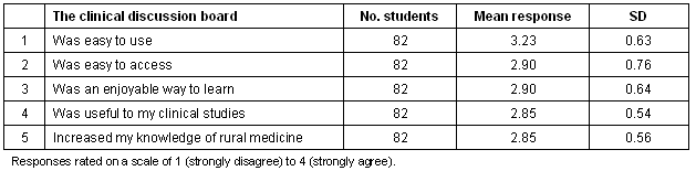 The results of the survey indicated that the students found the CDB 'easy to use' and 'easy to access'. This finding is especially important with respect to the rural rotation because internet facilities in a rural or remote area may sometimes be limited or problematic. The ease of use of the CDB is encouraging also in terms of future use by students, no matter where they may be undertaking their rural placement. Early comments relating to slow internet response times by a number of students using dial-up facilities enabled a configuration modification to be rapidly introduced to rectify the problem. This allowed students at all locations to access the Board in a satisfactory manner and is regarded as crucially important in terms of learning opportunities and educational equity within the Rural Medicine Program.
