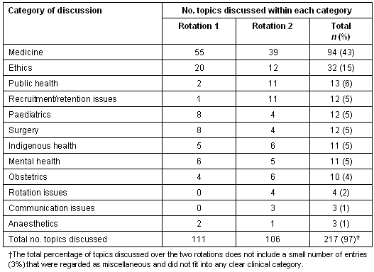 The breadth of topics discussed during these first two rotations was remarkable (Table 2). It was interesting to note the number of responses on the CDB that pertained to ethical issues. This highlights the importance of this area to students and may point to the need for more attention devoted to ethical issues during their training. Future research will focus on this dialogue and demonstrate how the students interacted with each other, sharing experiences and ideas on interesting, puzzling and challenging encounters, of which a significant proportion were unique to rural and remote environments. It is particularly interesting to observe that discussions entailing the management of uncertainty generated high levels of student input, often over a period of several days or, occasionally, weeks. High level thinking and acquisition of novel ideas or views is very evident.
