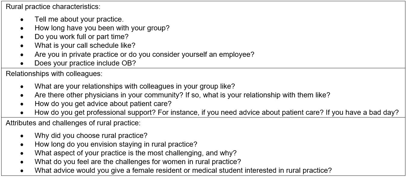Interview questions were developed by the research team, which included an experienced qualitative researcher. Each participant was interviewed by a member of the research team in a semi-structured format. The interviewers included two medical students, a Masters-level public health student, two family physicians, and an experienced medical educator, the majority of which were women. All interviewers described themselves to participants as ‘researchers’, and all had some working knowledge of contemporary primary care practice. One family physician investigator had experience in rural practice. Interview questions were pilot-tested with physician colleagues, and refined with feedback. In order to maintain consistency between interviewers, each interviewer used the same script; however, interviewers also asked neutral follow-up questions to solicit further information from the interviewees (eg ‘Tell me more’). Table 1 includes sample interview questions pertinent to rural practice and employment characteristics.
