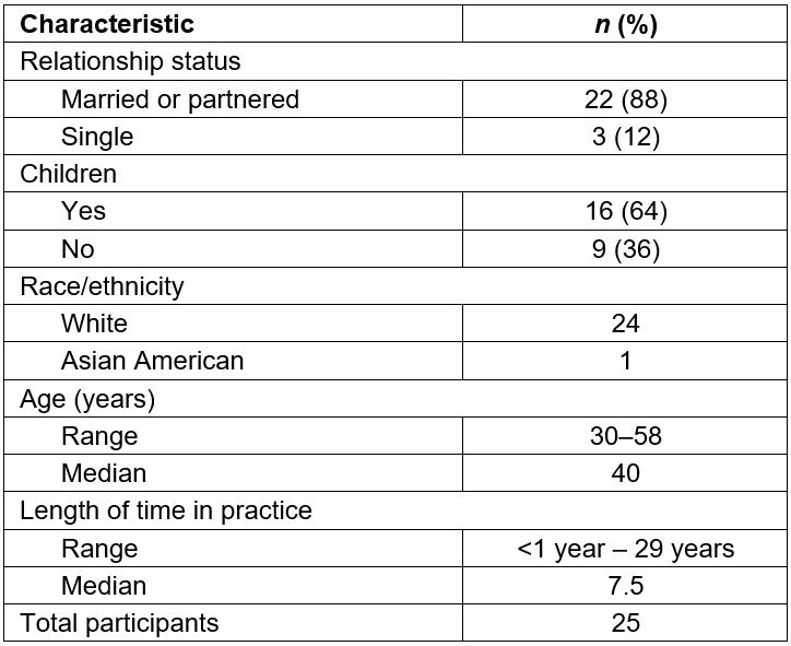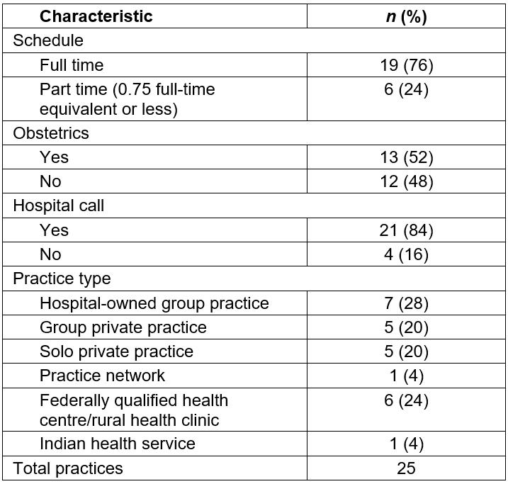 Participants came from 13 states and represented all regions of the continental USA; a map displaying their states of origin has been published previously29. Table 2 contains participants’ personal characteristics and Table 3 shows practice characteristics. The majority of participants were married or had a domestic partner, had children living in their home, and worked full-time. About half included obstetrics in their scope of practice. Seven of twenty-five (28%) of the participants’ practices were subsidized by the US government, either as federally qualified health centers, rural health clinics, or Indian health service practices. In the USA, federal subsidies are a strategy to support practices in the most underserved communities; subsidies increase payments received for patients with government-sponsored insurance plans, including those with very low income and the elderly.